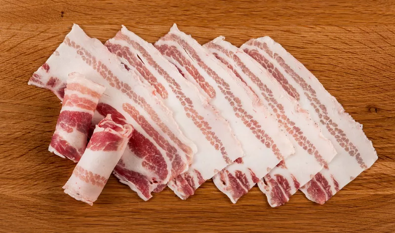 肉上無血,肥肉、瘦肉紅白分明、色鮮豔。最好的五花肉在接近豬後臀尖部位,